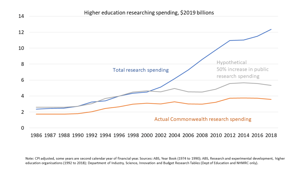 Suppose annual Commonwealth research spending was 50 per higher across the last few decades, all of it paid through block grants rather than generating additional costs via competitive grants. Up until the year 2000, as the chart below shows, a 50 per cent increase in public funding would have covered all research spending. But in 2018 Commonwealth funding 50 per cent higher than it was would still have left over 40 per cent of research spending unfunded (although there is about $1.9 billion in non-Commonwealth research income).