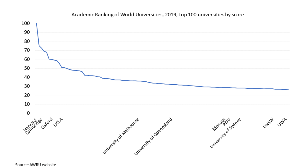 Research excellence can be measured against a standard, as our domestic ERA exercise tries to do, rather than placing exaggerated significance on the often small relative differences that drive the rankings. A the chart below shows, even in the top 100 there are a few exceptional universities with high absolute scores, and then a long tail of institutions, including all Australian top 100 universities, with minor differences in their scores.