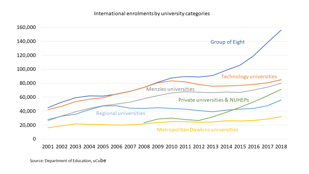 As the chart below shows, the pre-2020 international student boom was largely a Group of Eight and private sector affair (although many non-university higher education provider enrolments are in pathway colleges leading to a range of public universities).