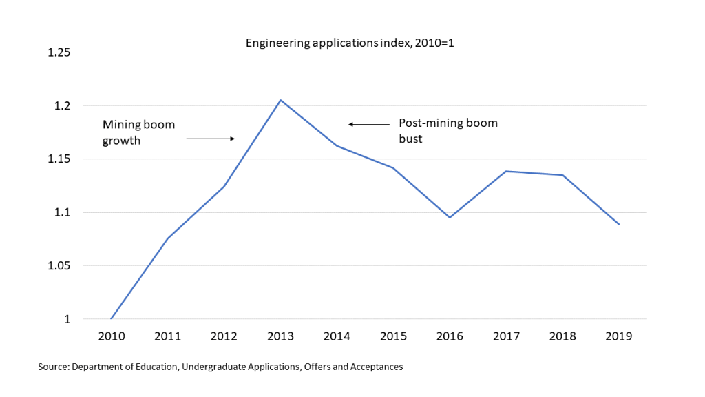 For smaller fields of education, important changes are hard to see in an applications share analysis. Engineering lost applications share between 2010 and 2019, but the chart below shows that during the mining boom engineering applications grew 20 per cent from their 2010 base, but then fell back when the boom turned to bust. At the margins, people with engineering in their cluster of interests were first steered towards it, and then against it, as employment prospects fluctuated.