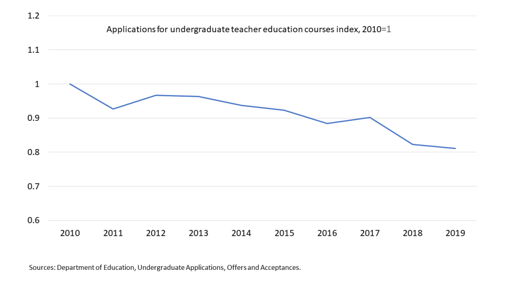 Recently teaching employment outcomes have not been too bad. So why are applications still going down? NSW and Victoria mandating minimum academic entry requirements is one factor. The LANTITE literacy and numeracy test, which is blocking some teaching graduates from professional admission, is also likely to be deterring potential applicants. These are obstacles to the desired employment outcome.