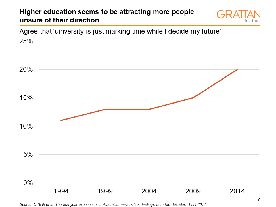 Another group who might think again are prospective students who are uncertain about their direction. Their share of respondents in the first-year survey increased in the two decades to 1994, to about 20 per cent who say that they are just ‘marking time’ at university, as seen in the chart below.