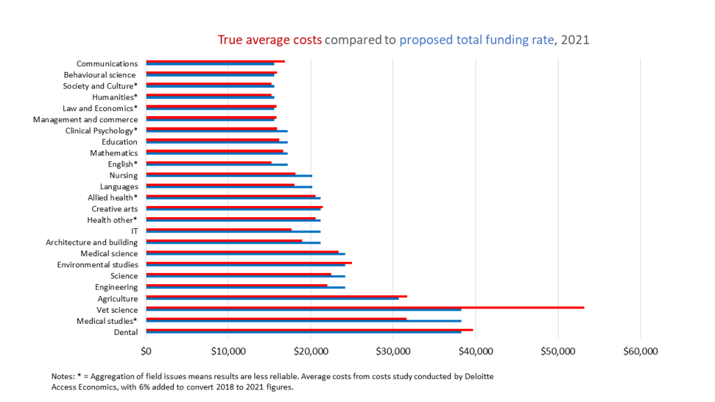 All this highlights a key issue with a policy focused on paying teaching costs with limited or no profit margins in each field. To avoid leaving universities with inadequate resources for teaching, especially in highly-regulated fields like health where expenditure may be hard to cut without losing professional accreditation, the underlying cost data needs to be highly accurate. That can’t be done when the cost data collection does not distinguish between fields that have different pedagogical practices.
