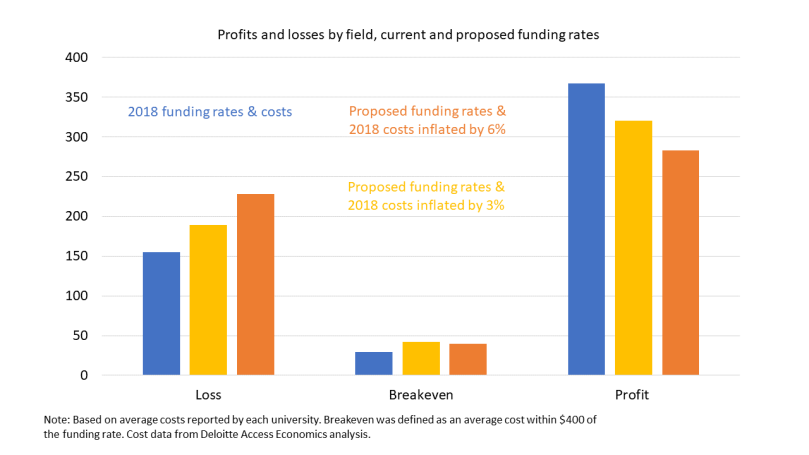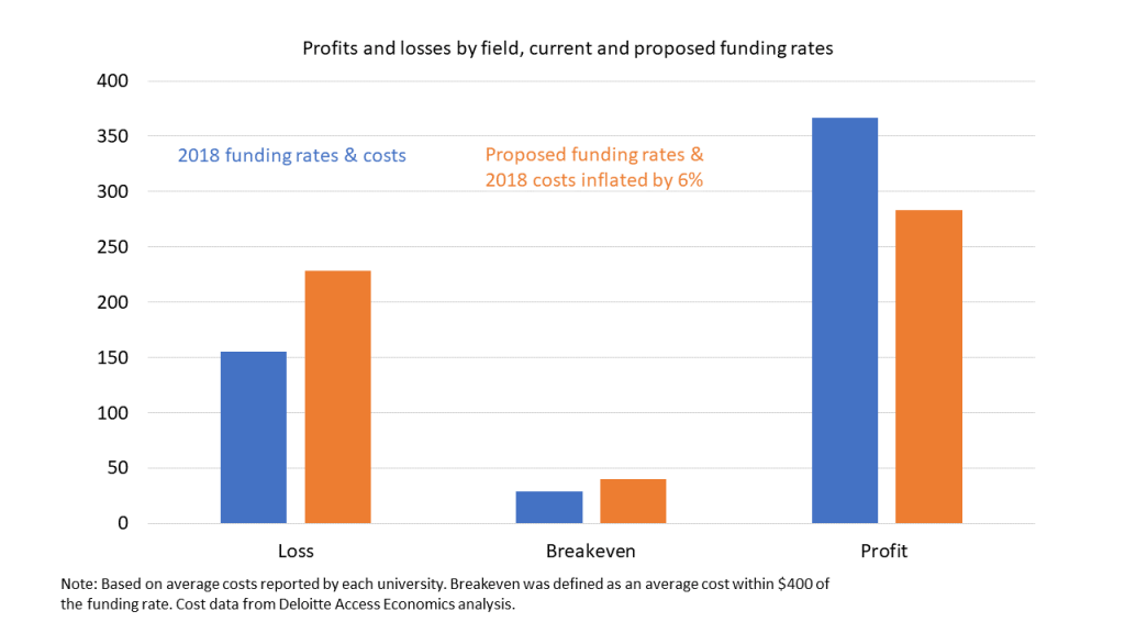 In the current funding system’s original design, which dates back to the early 1990s relative funding model, a mix of profits and losses did not matter. Policymakers knew that costs by field would vary between institutions, as the recent cost data confirms. The original relative funding model rates were used to calculate an overall block grant. Swings and roundabouts were expected. Universities would make money in some fields and lose it in others. What mattered was that total block grant funding was sufficient to fund the university’s mission.