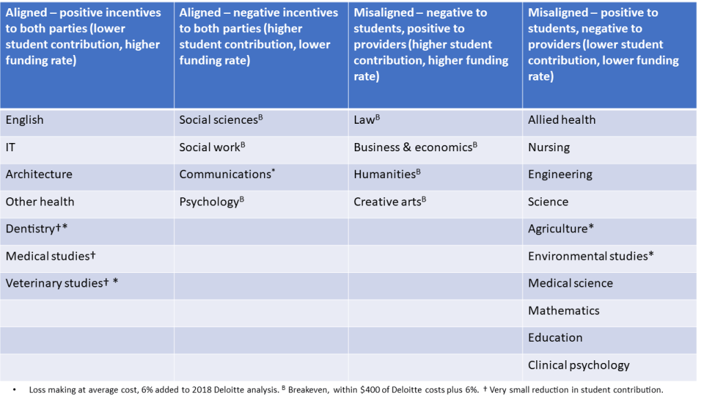 But more often student and university incentives are misaligned – there is a higher student price to discourage demand, but an increased university funding rate that encourages supply; or a lower student contribution to encourage demand, but a lower university funding rate that discourages supply.