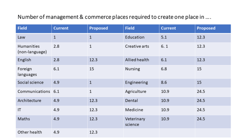By moving from eight to four Commonwealth contribution clusters the Tehan reforms increase the number of field-of-education trades with neutral student place implications – creating one new place in a preferred field costs only one place in another field in the same cluster. That should be a positive for flexibility. Teaching, allied health and IT, for example, are in different clusters now but would be in the same cluster next year.