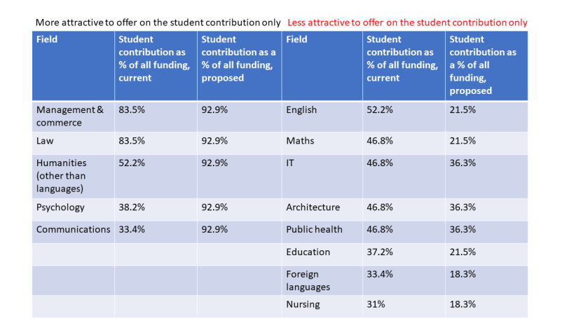 A complicating factor in this scenario is that although over-enrolments become more attractive in the $14,500 fields, they become less financially viable in other fields, as the chart below shows. Yet again the decision to create wider imbalances in student contributions is causing problems.