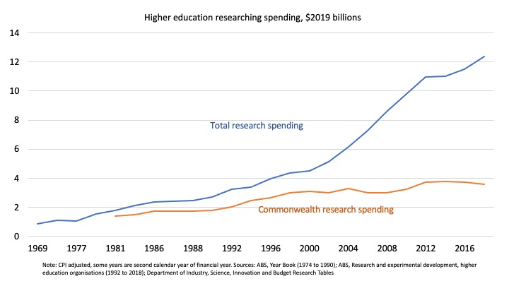 From the 1960s to the 1980s research was the activity that distinguished the universities from the Colleges of Advanced Education that enrolled a growing proportion of all higher education students. But as the chart below shows total spending on research was still low compared to its pre-COVID-19 21st century peaks. University research on a massive scale is a surprisingly recent phenomenon.