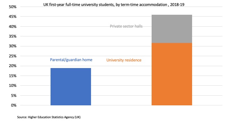 A high willingness of students to live away from home underpins a British national higher education market. The chart below shows that less than 20 per cent of UK full-time first-year students live with their parents. The population of first-year students include some older people who would have moved out before commencing their university studies, but more than 45 per cent of students live in university or private sector student residences.
