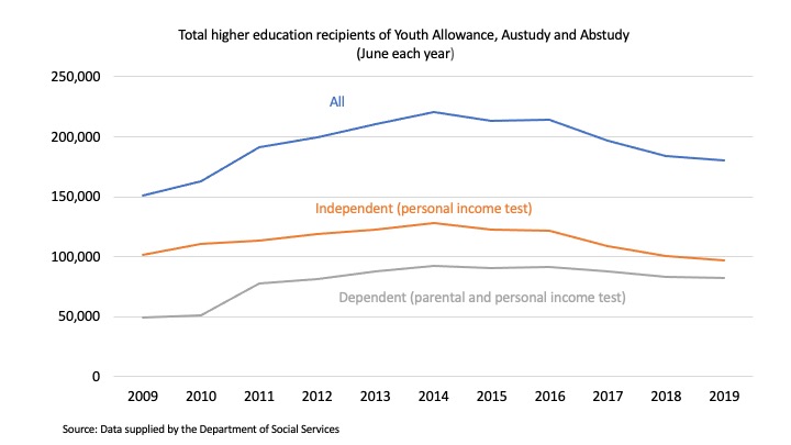 The only other big policy change I can think of that might have had an impact was the conversion of the Start-up Scholarship to a loan over 2016 and 2017. The scholarship gave twice annual lump sum payments of about $1,000 even for students who were on low fortnightly rates of income support, due to their own or their family’s income. Possibly without this incentive some students decided to avoid engaging with Centrelink bureaucracy.