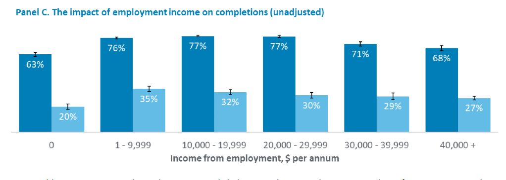 No employment income is associated with lower completions than any other income category. I am not sure how to interpret this result. On the Department’s data, many of the students who are not working are on income support, but in their analysis income support is a positive for completion rates.