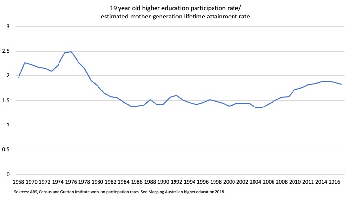 But with these caveats at the 1976 peak the 19 year old participation ratio was 2.5 on his or her parent generation attainment (16.45%/6.6%). This was the 1970s surge in enrolments interacting with a parent generation born in the 1920s and early 1930s that had low levels of higher education attainment.