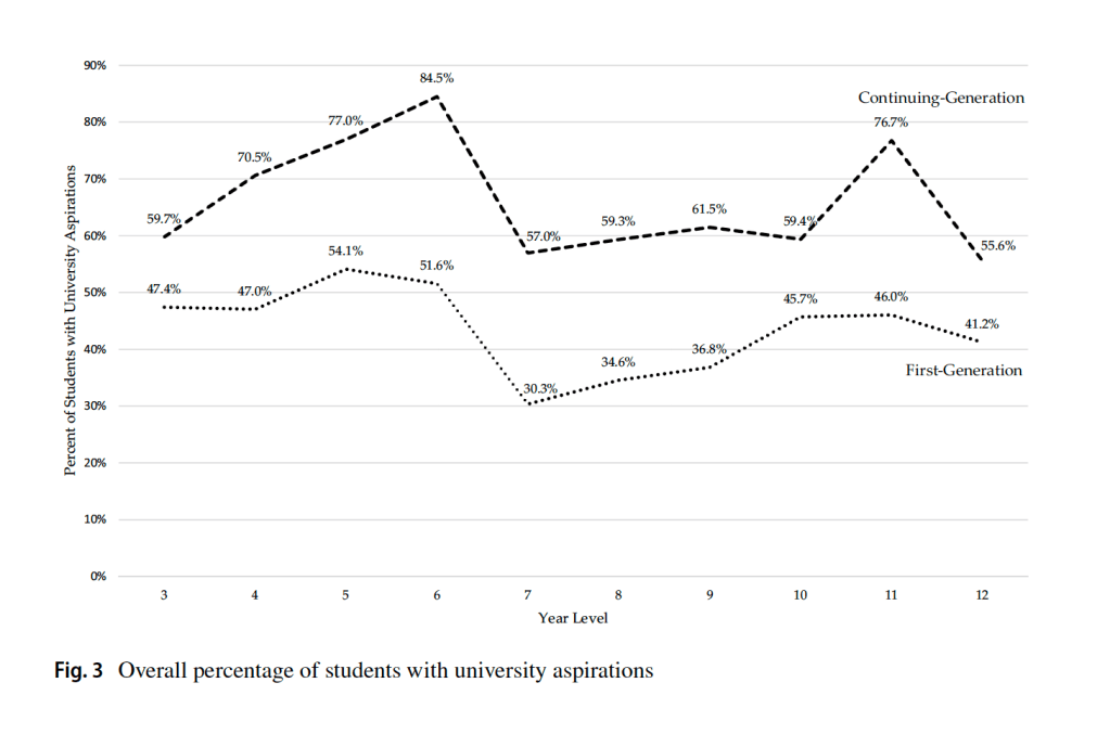 Many equity programs aim at increasing aspirations for university. In the study written up in The Conversation, covering four NSW government school cohorts each over four years, we can see in the figure below from the academic journal version that ‘first generation’ students are always less likely to aspire to go to university. (Each school year level is made up of two separate cohorts in different calendar years; despite this the volatility is perhaps more interesting than the absolute numbers. I have long puzzled over why aspirations surveys can get such varying results).