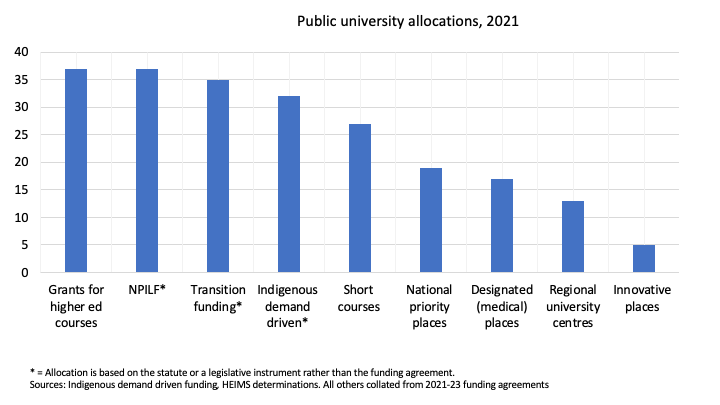 Job-ready Graduates introduced several new or substantially revised pots of money. Not all universities receive each of these. As the chart below shows, programs driven by criteria or formulas set out in legislative instruments (NPILF and transition funding) or the legislation itself (demand driven funding for Indigenous students from regional and remote areas) benefit the largest number of universities. Apart from the general grants for higher education courses (sub-bachelor through to masters coursework, except medicine), the ministerial/departmental discretion programs benefit fewer universities.