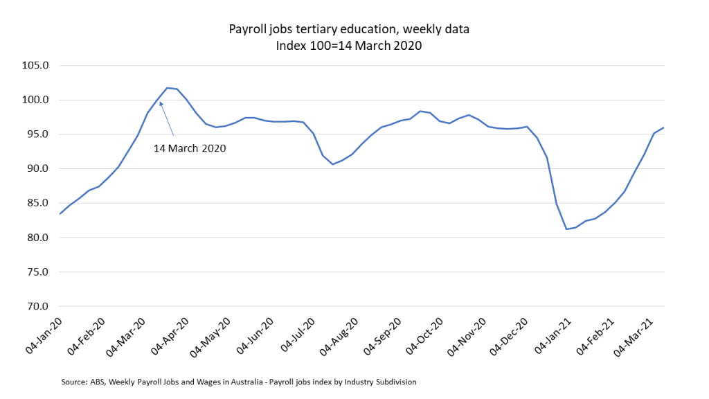 The chart also shows that with a base index of 100 on 14 March 2020, when the China travel ban was in place but the full travel ban was yet to be imposed, the index was at 96 on 13 March 2021. Applied to universities that would be a fall of about 9,000 jobs (including casuals) from the WGEA level as of late March 2020.