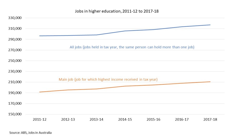 Using ATO data, in the TableBuilder version of Jobs in Australia the ABS has started publishing total higher education jobs during the financial year. This is based on the employer’s industry. If I understand the methodology correctly, with large multi-purpose organisations only the higher education part is included, when other data sources are counting everyone employed by universities and sometimes also their subsidiaries, whether or not the ‘activity unit’ they work in is related to higher education or not.