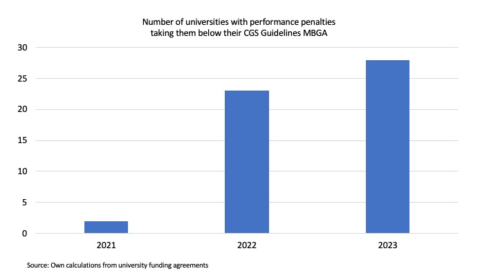 The MBGA adjustments to ‘remove the performance-based funding amount’ take some universities below the minimum MBGA specified in the CGS Guidelines. The number is four in 2021 but increases to 23 in 2022 (ie more than half) and 28 in 2023. This is because performance penalties increase over time, averaging 1.2 per cent in 2021 and rising to 3.5 per cent in 2023.