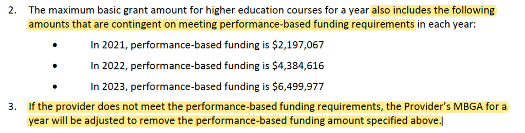 This performance penalty arrangement seems to create two MBGAs – the total listed in Table 1a for each year and a second MBGA which is the Table 1a amount minus the performance penalty for that year (‘base’ MBGA is not a legal concept, it is ongoing funding while the other categories are new or temporary).