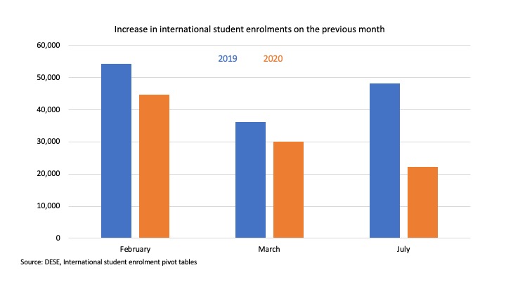 At least at Sydney, most first semester 2020 student fee due dates were prior to 30 March (I could not find La Trobe’s dates). And Sydney is one of the ‘China universities’ affected by a border closure to China from 1 February 2020. The ‘India universities’ are unlikely to have had a March trigger month, as Indian students mostly arrived before the international borders closed completely to routine travel on 20 March 2020.