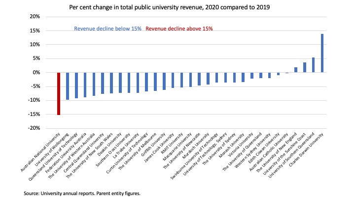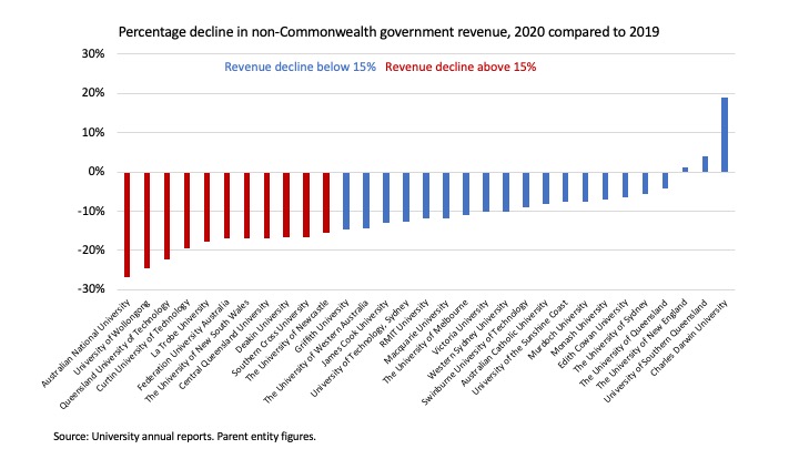 With the continuing caveat about cash flow timing issues, we can examine overall university revenue declines, as calculated from their annual reports. On an annual basis only one university, the ANU, would have met a 15 per cent decline requirement, with none anywhere near 30 or 50 per cent. Universities in the 7–10 per cent revenue decline range might have used a bad July to qualify on 15 per cent.