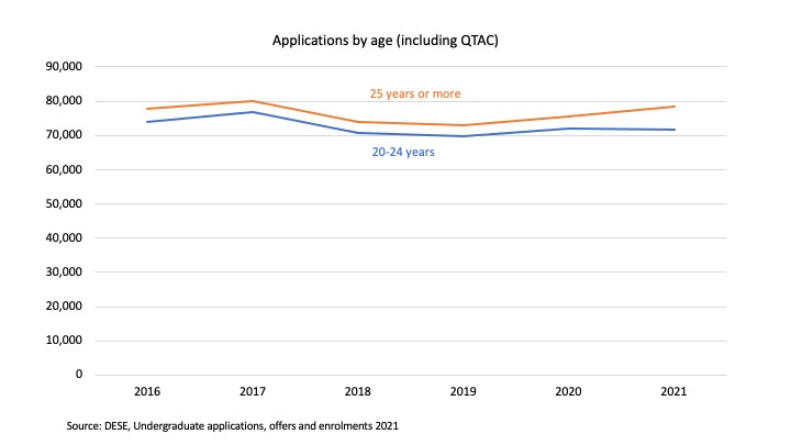 For older people counter-cyclical enrolments would be more at the postgraduate than undergraduate level, but I would class these trends as at most moderately consistent with the overall hypothesis. The COVID recession was much milder and shorter than I expected early last year, but there was still significant doubt about economic prospects when most of these applications would have been lodged, in late 2020.