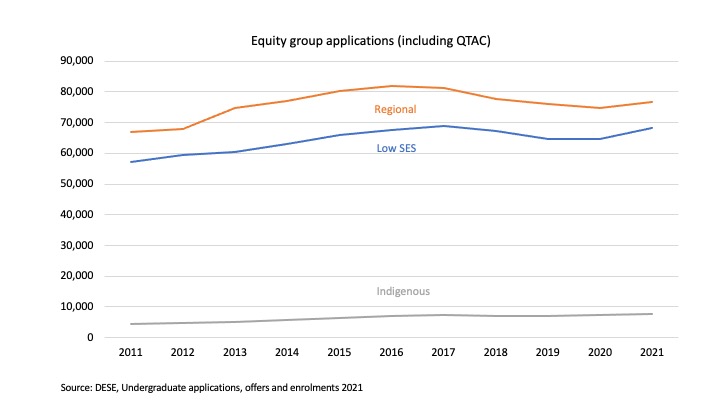 The trend in total domestic application numbers is complicated by a change to the Queensland school starting age in 2007, which produced a dip in Year 12 numbers in 2019 with negative consequences for university applications for 2020 and a rebound in 2021. DESE has produced trend lines with and without QTAC figures to account for this issue, with the non-QTAC figures producing an increase of 2.3 per cent between 2020 and 2021 (4.4 per cent with QTAC). It’s not super-fast growth, but the 2.3 per cent is the highest since 2015.