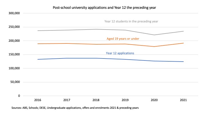 Year 12 serves multiple purposes. If more students take Year 12 via VET in Schools or other non-ATAR pathways the percentage of all Year 12s going on to university will decline. But the continuing decline in Year 12 applications despite a recovery in total Year 12 numbers seems surprising, unless growth in the latter is coming entirely from non-ATAR students.