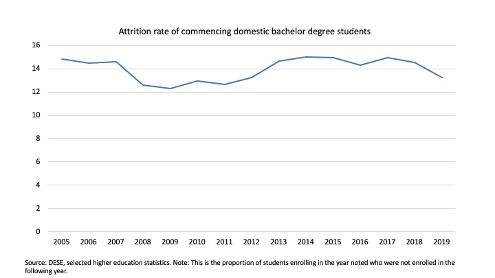 I would expect attrition to go down in a recession, since employment is a common reason students give for dropping out. The previous drop in attrition coincided with the global financial crisis. But the timing only partly works, since most first semester re-enrolments (or non-re-enrolments) would have occurred before COVID-19 hit. Australia as we knew it did not end until March 2020.