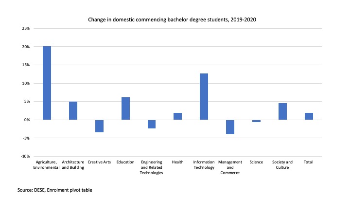 As usual, trends were not uniform across fields of education. Growth was strongest in the agricultural and environmental category and also double digit in IT. Four of the eleven broad fields had fewer commencing students in 2020 than in 2019.