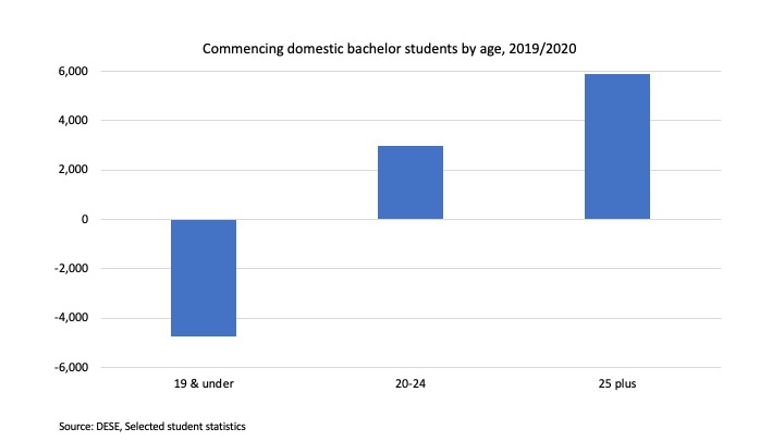 Domestic bachelor degree commencing students were up 1.8 per cent between 2019 and 2020. As the chart below shows, that growth was due to older commencing students, with recent school leavers aged 19 and under down by 3.3 per cent. With fewer Year 12 students to draw on the decline in teenage commencing higher education students is not surprising.