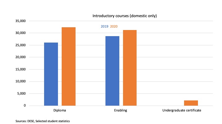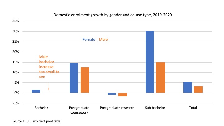 Increases in total postgraduate enrolment were across different qualifications, but with the largest spike in graduate certificates, one of the government’s ‘short courses’. As for the undergraduate certificates, in 2020 (although not 2021) some of these were offered at discount student contributions of $1,500 or $2,500, depending on discipline.