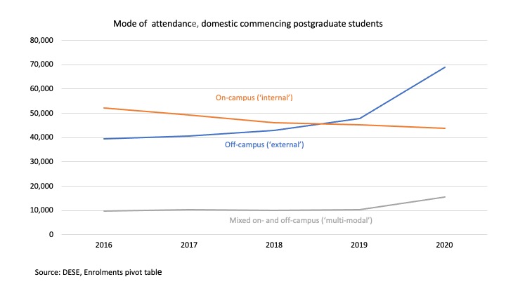 Forced remote learning makes on/off campus trends hard to assess, but the statistics are striking. On-campus postgraduate coursework was in decline long before COVID-19 and closed campuses meant that it could not benefit from the significant increase in postgraduate enrolments.