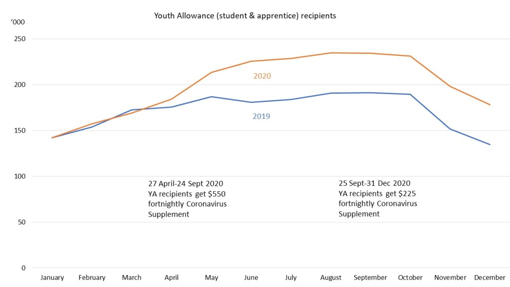 My paper includes Youth Allowance data showing that 2021 recipient numbers exceeded 2019 levels, despite being lower than in 2020 — perhaps students who went on benefits remained on them, despite an improved labour market. But in 2022 numbers are back below 2019 levels.