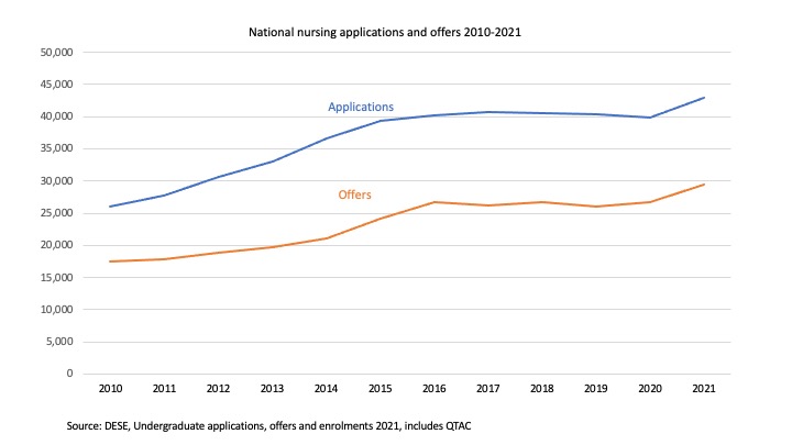 In 2021 nursing offers increased by much less than applications. This might reflect bottlenecks in clinical training preventing rapid expansion. But Job-ready Graduates was unfavourable for nursing supply. Total funding per student place was cut by about 8 per cent, reducing the incentive to prioritise nursing. Student contributions were cut by more than 40 per cent, making ‘over-enrolments’ – enrolments funded on student contributions only – a financial risk universities need to avoid.