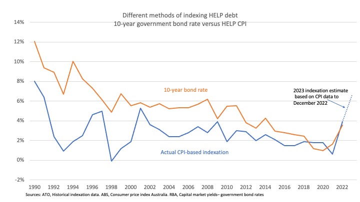 As the chart below shows, generally the bond rate is higher than CPI-based indexation, which is why previous governments have sometimes proposed charging a ‘real’ rate of interest. But in a few recent years CPI has been higher, and this is especially likely to be true in 2023 (I need March quarter CPI to calculate the 1 June 2023 indexation level; as a guide to where things are heading I used the December quarter in the unusual lagged indexation formula required in the higher education legislation).