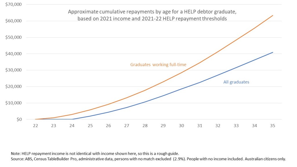 A weakness of both the NTEU approach and mine is that they assume linear careers. In practice incomes vary, especially for women with children. Time out of the labour force or working part-time lengthens repayment times. Each analysis assumes no voluntary repayments, which shorten repayment times.