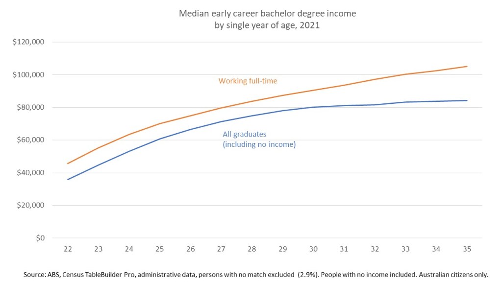 The next chart looks at median income by single year of age in the early career period when most HELP debt is repaid. Initial income levels look affected by people in jobs that don’t require degrees, but as professional careers start and graduates are promoted or switch to better jobs income increases rapidly.