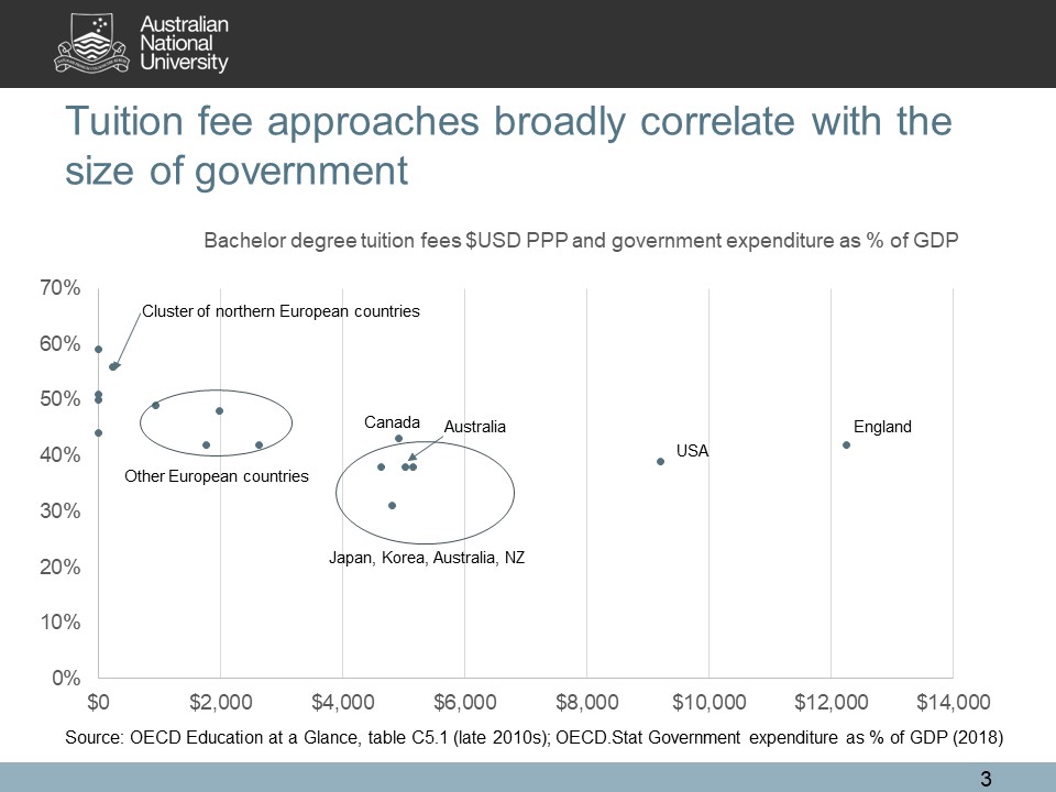 My theory of why countries differ on this issue draws loosely on the work of Julian Garritzmann. We observe broad coherence between higher education finance systems in each country and their overall tax and social service/benefits systems. The chart below shows patterns in the OECD. Australia is in a cluster of countries in our region with government expenditure below 40 per cent of GDP and quite similar fees in $USD purchasing power parity terms. The countries with free higher education tend to have governments that consume more than 50 per cent of GDP.