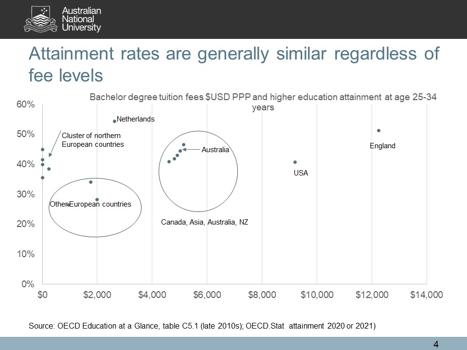 Counter-intuitively higher education funding systems appear to have only small effects on overall higher education participation or attainment rates. While some moderate fee European countries have lower attainment rates by age 25 to 34 years, most other countries have 40-something per cent attainment, with a couple exceeding 50 per cent.