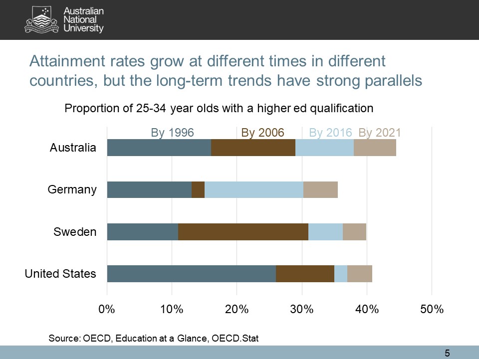 While absolute levels of attainment differ a little between countries, the long-term trends have strong parallels, as seen in the chart below. Funding systems are not the only drivers; there are other issues including school systems (streaming in Germany steers students to vocational education) and country-specific labour markets, which affect the need for higher education qualifications.