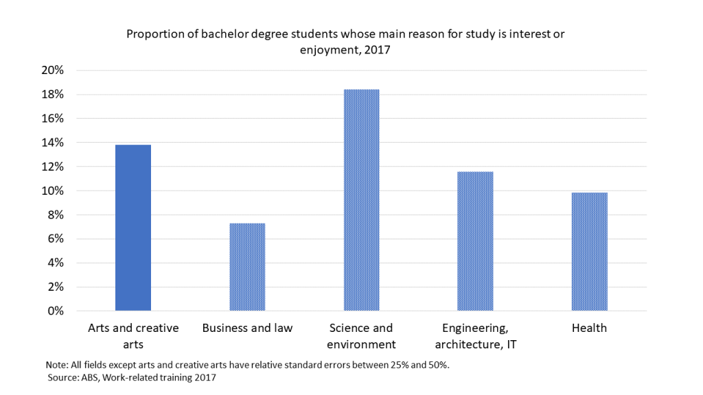 Courses like arts have a less predictable relationship with the labour market than degrees aimed at specific jobs. Arts students are more likely to choose their course based on interests alone rather than being concerned about labour market outcomes. And because arts graduates end up in many jobs the specific information about occupations and industries that influences choices in the more vocational fields is less available.