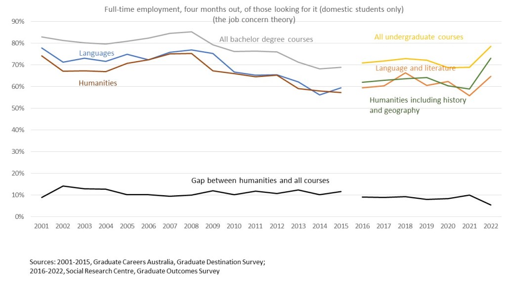 Full-time employment prospects for recent bachelor degree graduates start declining in 2009 after the GFC damaged economic confidence and reached their nadir in 2014. Humanities outcomes are persistently about 10 per centage points worse than the all bachelor degrees figure.