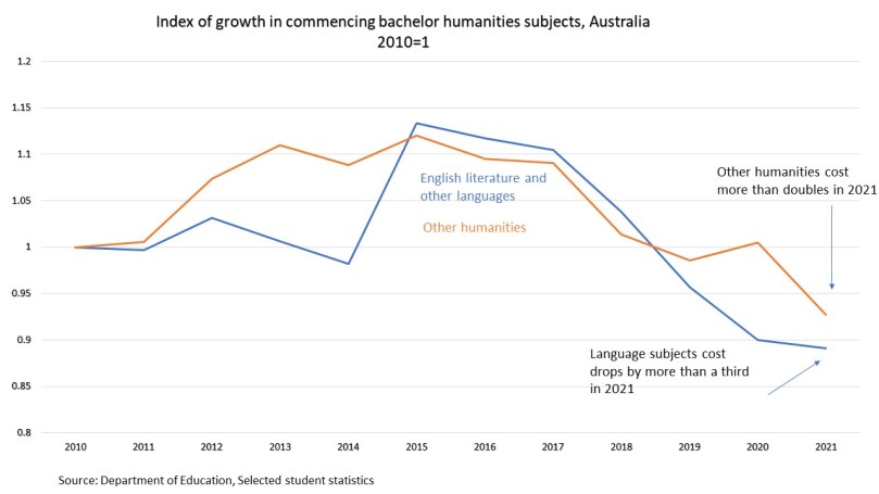 Any theories about why the humanities enrolments declined are speculative. We rarely ask prospective or actual students how they choose between post-school options. But there are theories, which I am quoted on in the article. The theories are not mutually exclusive and so combined effects are possible.