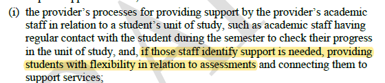 The draft student support guidelines also include a broader requirement to offer ‘flexibility in relation to assessments’ to students identified as needing support, seemingly for any reason.
