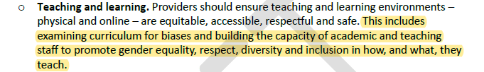 A possible more broad-ranging crossing of academic boundaries is in the recently released draft action plan on gender-based violence in higher education. The highlighted section below suggests that promotion of the action plan’s worldview should be included in university curriculum. Academics should be respectful in the way they teach, but in my view course content should be decided between them and the relevant approval processes, not mandated by government.