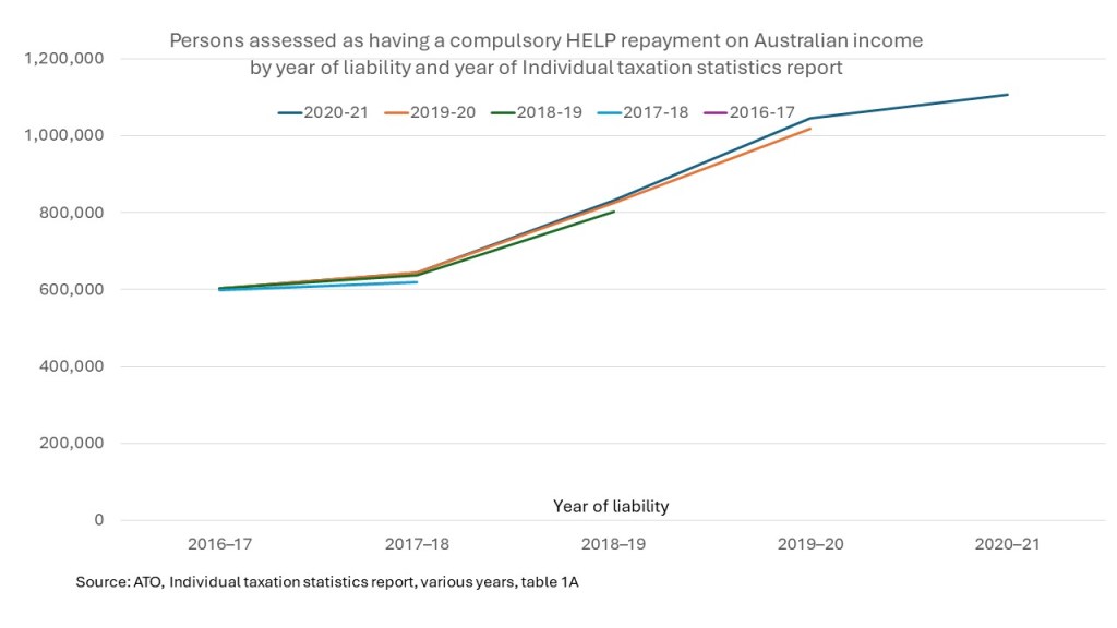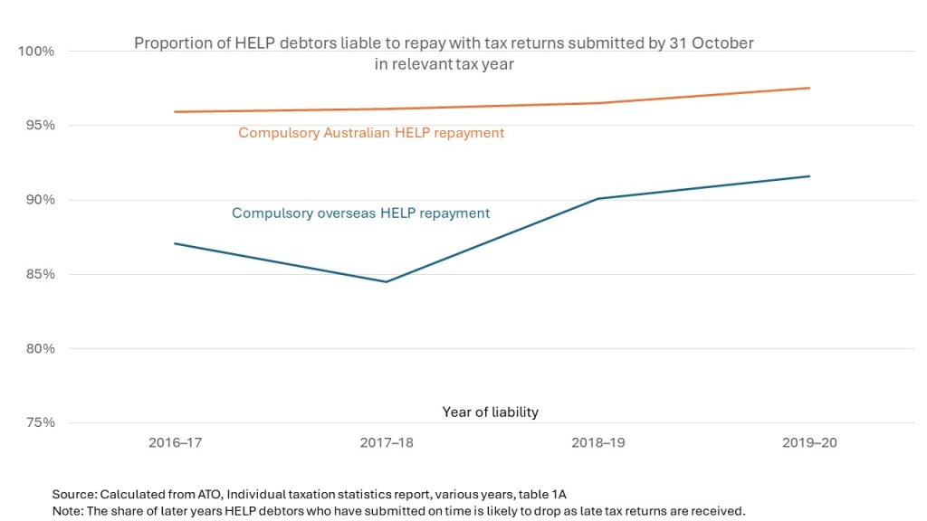 The ATO’s Individual income statistics reports give some guide to this issue. For the latest tax year the ATO reports on income tax returns filed by 31 October, but earlier tax year figures are updated to reflect processing of late tax returns. Typically the ATO collects HELP repayments from another 25,000 or so debtors in the financial years after the amount was originally due.
