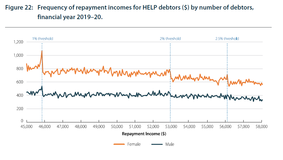 These analyses are better done comparatively with non-HELP debtors (in case earnings around the thresholds correspond with incomes that are common for other reasons). However income bunching under the threshold repayment cliffs has also been observed previously, so there is little reason to doubt that the Accord final report chart identifies a real practice.