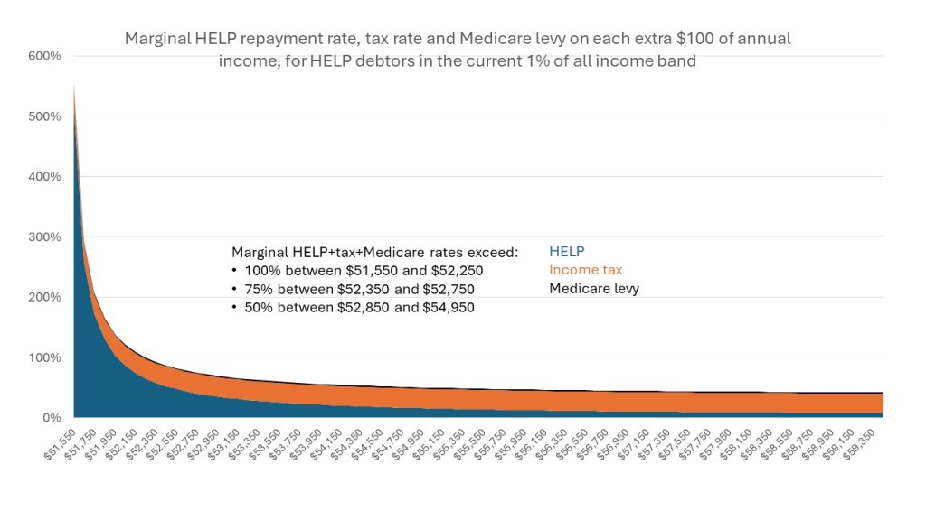 My support for the % of all income system was in the context of an earlier system where the first threshold was higher than now – e.g. the $55,783 in 2017-18 – and the first repayment rate was 4% of all income. Although the EMTRs just above the threshold were huge, anyone whose income consistently reached the threshold was likely to repay in full.