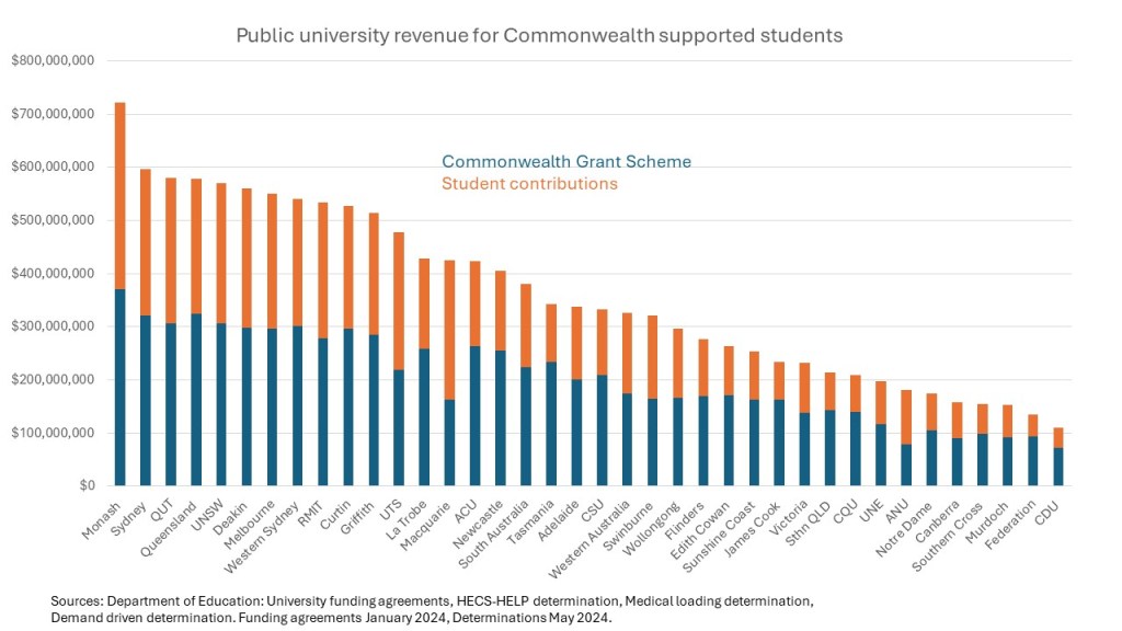 The chart below aggregates the programs into their two main categories, the CGS and student contributions, and ranks them from the largest recipient of funds, Monash University at $722.4 million, to the smallest, Charles Darwin University at $157.8 million.