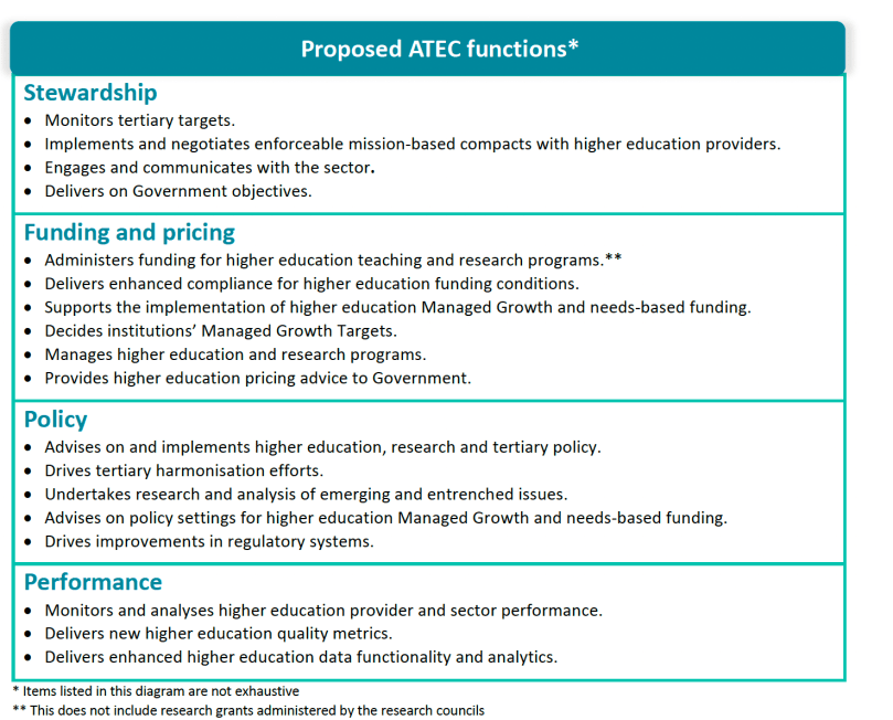 ATEC’s proposed functions are listed in the chart below. I like the data functions. But there is nothing in the consultation papers on the state of the TCSI data system. Unless it can deliver timely enrolment data ATEC as outlined is not feasibile.